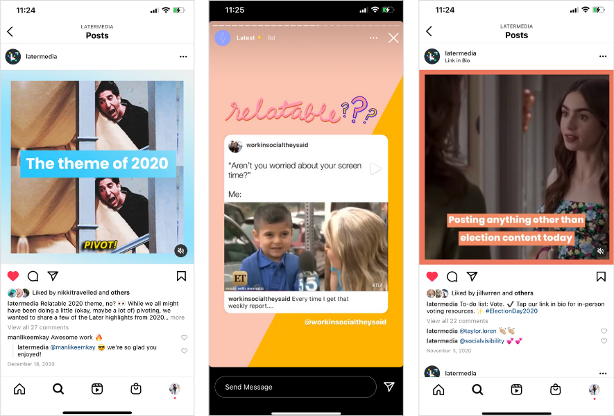 For example, on Later's Instagram profile, we'd previously been using workdays as our core posting schedule. But with a bit of testing, we realized Sundays were our best days for engagement as we were able to hold our audience's attention for longer!