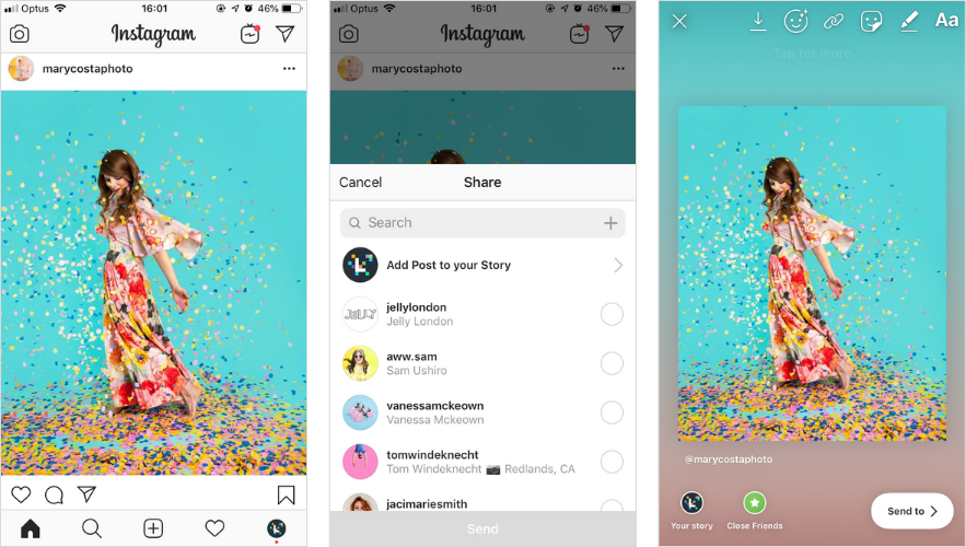 The ability for users to share feed posts to their Instagram Stories or DMs is a handy feature that will help you reach even more people.