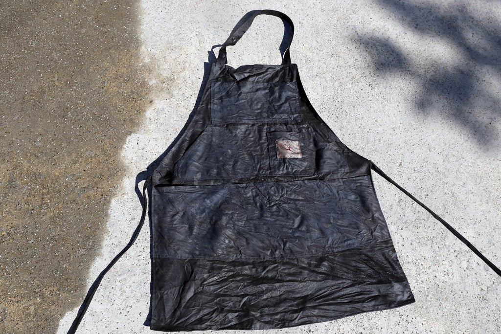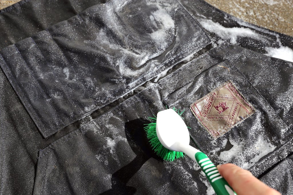 Before applying any wax your fabric should be clean and free from dust and debris. In my case I am waxing my work apron, which has seen lots of use and needed to be brushed, blasted with compressed air, and cleaned with the hose and detergent and then scrubbed again before it was ready.